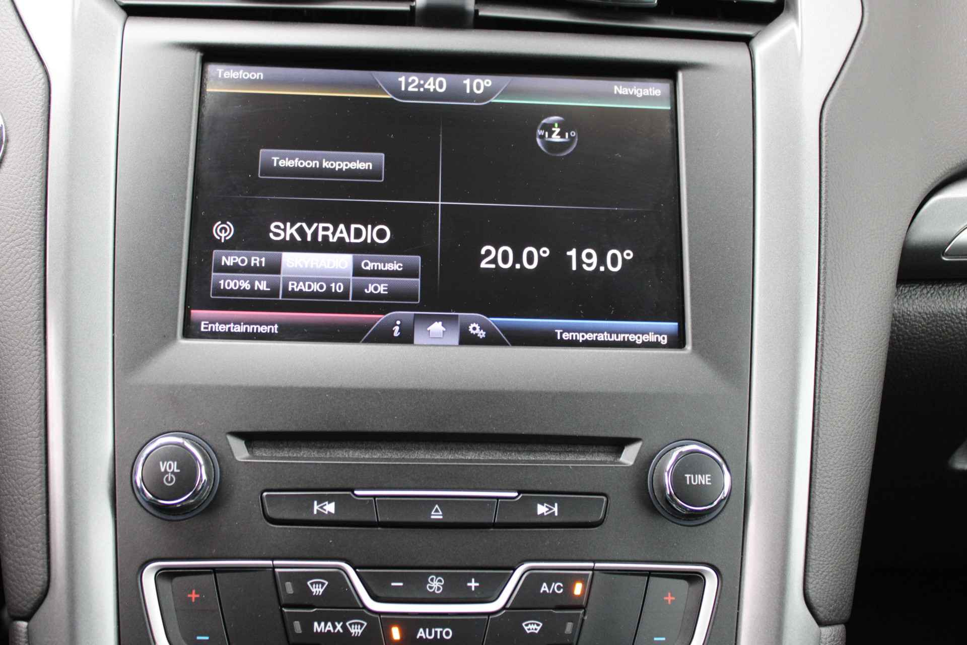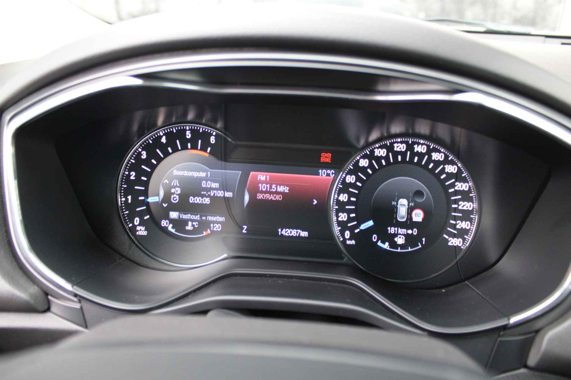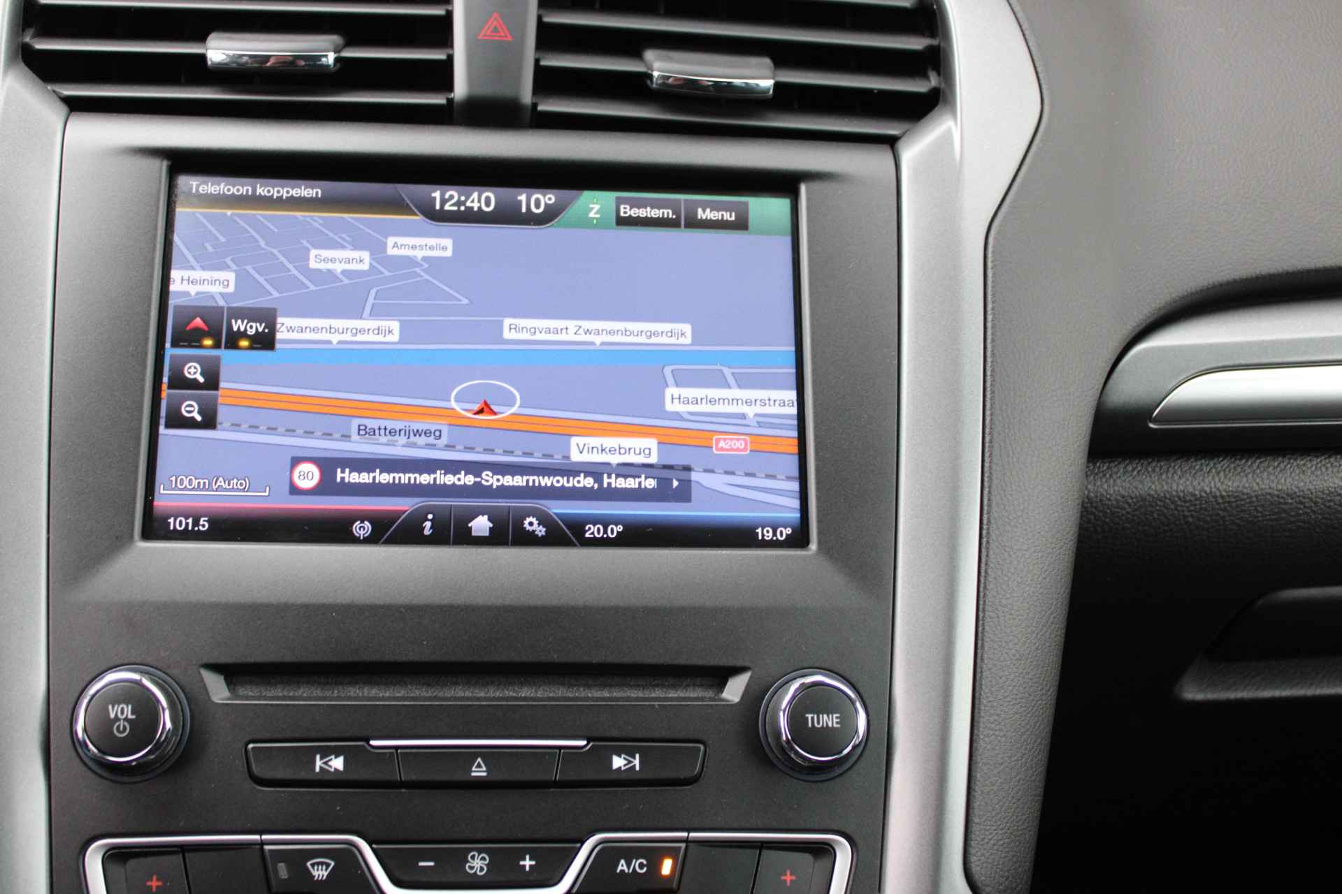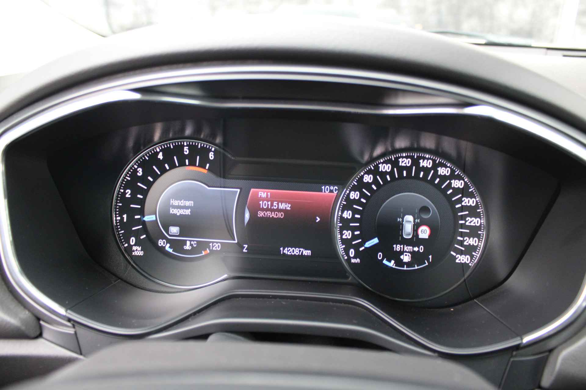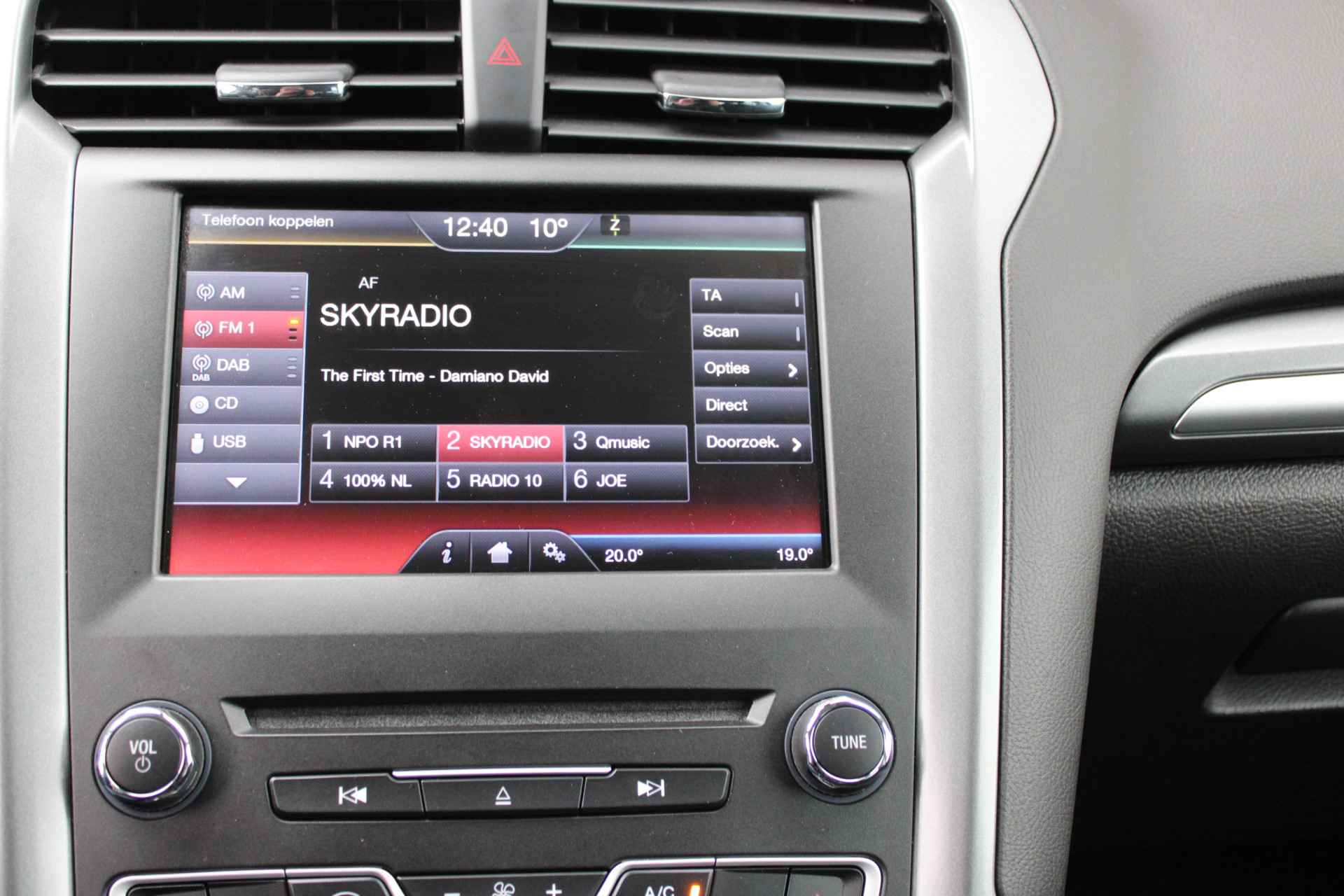 De bediening van het audiosysteem en het full map navigatiesysteem gebeurt met knoppen op het stuur en als u wilt zelfs met uw stem. De audio is overigens voorzien van DAB-radio voor een altijd heldere ontvangst. Het spreekt voor zich dat een auto als deze ook van automatische airconditioning is voorzien. Inparkeren en uitparkeren kost geen enkele moeite dankzij de parkeersensoren. In deze Ford kunt u zich concentreren op het verkeer, terwijl de auto de omgeving voor u in de gaten houdt. Een automatisch inschakelbare verlichting zorgt dat de verlichting aangaat als het donkerder wordt - in tunnels bijvoorbeeld - en de regensensor schakelt de ruitenwissers in als het nodig is. U hoeft er niets aan te doen. De cruise control heeft een feilloos geheugen. Als u even vaart heeft geminderd, bent u na één klik weer op de oude snelheid. De uitrusting van deze Ford is met keyless entry, automatisch dimmende binnenspiegel, lederen stuur, isofix-aansluiting, toerenteller en bagage afdekhoes behoorlijk compleet.
