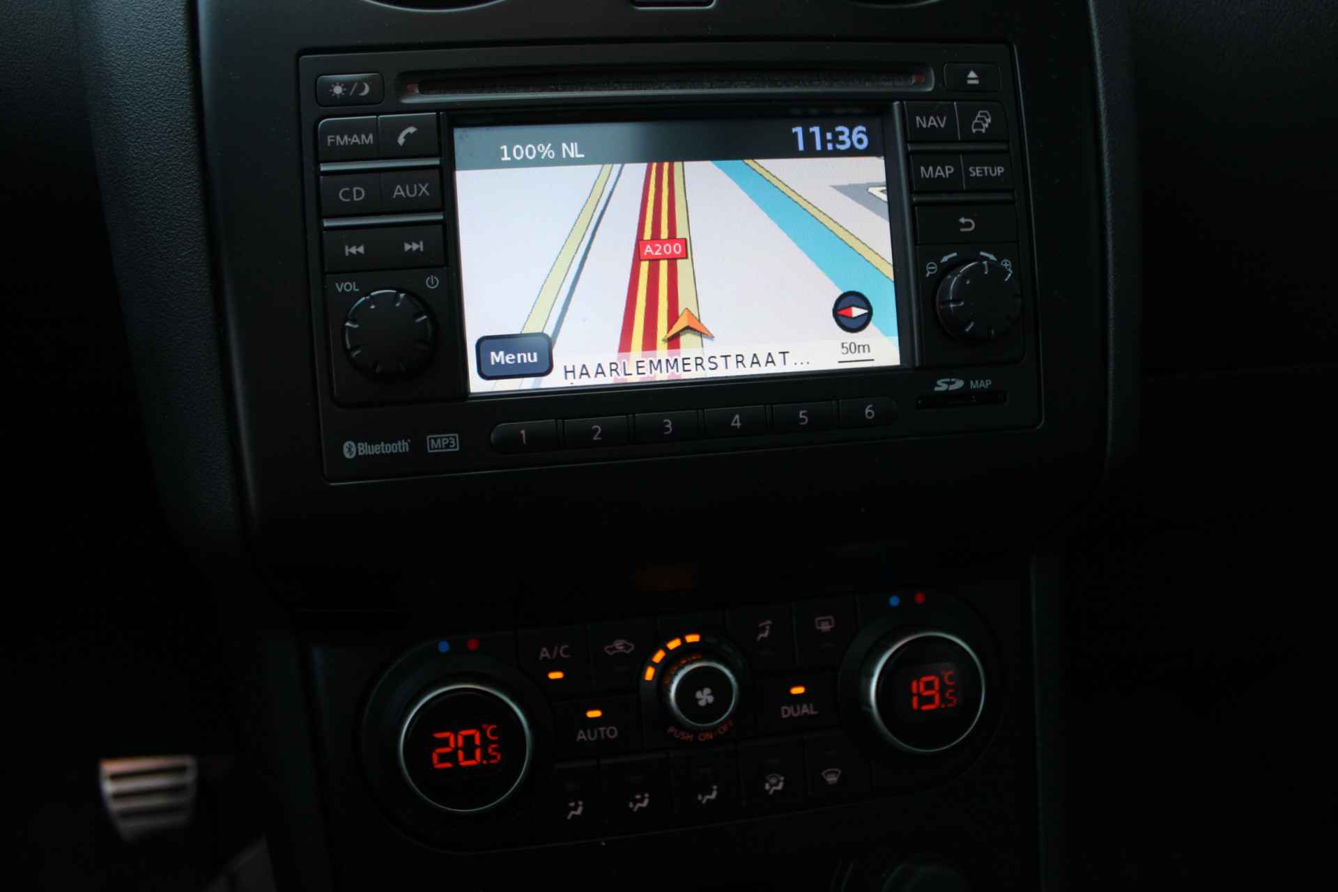 Overzichtelijk en veilig parkeren met de achteruitrijcamera. Overal en altijd. Het vernuftige Bose audiosysteem levert een muzikale sensatie onderweg. Ook is de auto voorzien van automatische airconditioning. Het hoort bij een intelligente auto als deze dat hij zelf in staat is om zijn omgeving in de gaten te houden. Dat doet deze Nissan met een automatisch inschakelbare verlichting en een regensensor. Relaxt rijden is meegeleverd in de vorm van cruise control. Deze Nissan is voorzien van Bose-audioinstallatie, full map navigatiesysteem, keyless entry, automatisch dimmende binnenspiegel, lederen stuur en isofix-aansluiting.